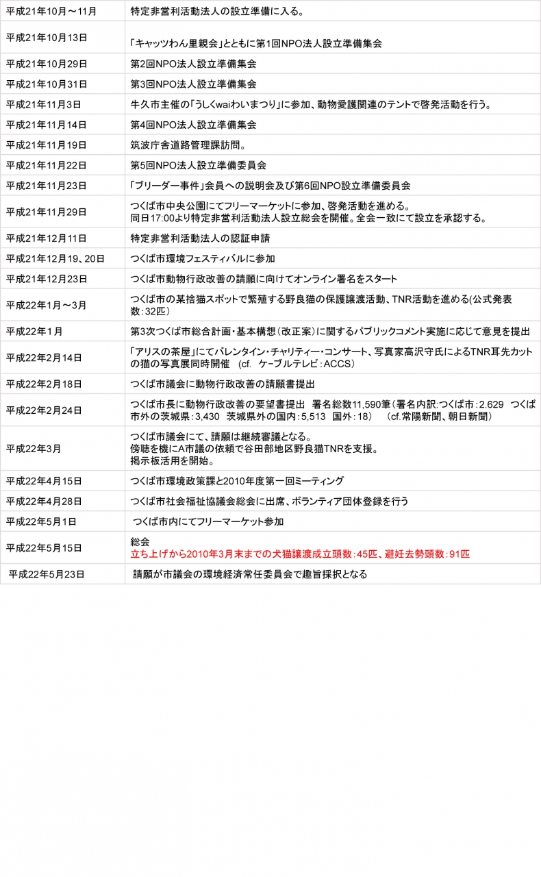◆活動の目的認定NPO法人 動物愛護を考える茨城県民ネットワークは、動物の権利擁護を推進し、殺処分される動物の数を減らすこと、さらに市民や子どもたちへ命の大切さ・動物を愛護する精神を伝え、動物福祉の充実した社会の実現を図ることにより、人も動物も快適に共生できる町づくり及び環境の保全、ひいては社会全体の利益の増進に寄与することを目的とする。
